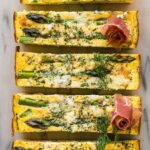 - Remove and Serve: Using the parchment paper edges, carefully lift the frittata out of the pan. If it sticks, gently run a butter knife around the edges first. Transfer to a serving platter and slice between asparagus rows. Garnish with more fresh herbs, parmesan, and optional prosciutto or other garnishes. Enjoy warm or at room temperature.