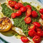 I like garnishing this with fresh basil leaves on top of the pesto — they add an herbal pop and look beautiful. The grape tomatoes also double as a sweet, colorful garnish that balances the richness of the fish. A wedge of the grilled lemon on the side lets everyone add a little extra zing if they want.