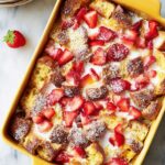 - Serve: Remove from the oven and immediately sprinkle the casserole with the remaining diced strawberries and a tablespoon of confectioners’ sugar for a touch of sweetness and decoration. Serve warm for best taste.