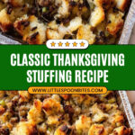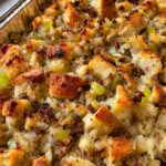 This World’s Best Thanksgiving Stuffing recipe features a savory blend of sausage, sautéed vegetables, and French roll bread cubes soaked in a flavorful broth mixture, baked to perfection with a deliciously crispy top. Perfect for holiday gatherings, this stuffing combines traditional flavors with the perfect balance of moisture and texture for a crowd-pleasing side dish.