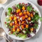 A vibrant and flavorful Butternut Squash Salad featuring roasted, spiced squash tossed with fresh greens, creamy goat cheese, sweet Medjool dates, crunchy pistachios, and juicy pomegranate seeds, all brought together by a tangy cider date dressing. Perfect as a hearty main or a festive holiday side dish.