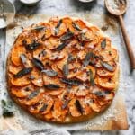 For holiday dinners or dinner parties, I like to serve this tart on a large rustic wooden board sprinkled with extra parmesan and fresh sage sprigs around the edges. Cutting it into smaller squares for appetizers is always a crowd-pleaser too!