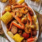 A flavorful Cajun Seafood Boil featuring snow crab, jumbo shrimp, andouille sausage, baby potatoes, and corn on the cob, all cooked in a spicy, seasoned broth and tossed in a rich homemade garlic butter sauce. Perfect for a communal and festive seafood feast.