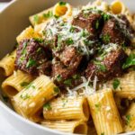 This Cajun Steak Tips in Cheesy Rigatoni Parmesan Sauce recipe combines tender, spicy steak cubes with creamy, cheesy rigatoni for a comforting and indulgent meal. The Cajun-seasoned steak is seared to perfection and tossed in a rich Parmesan and mozzarella sauce that coats the pasta beautifully, making it a perfect dinner for steak and pasta lovers alike.