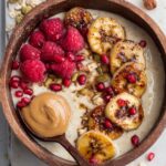 - Assemble the dish: Serve the oatmeal in bowls and top generously with the caramelised bananas, fresh raspberries, pomegranate seeds, a dollop of your favourite smooth nut butter, and a sprinkle of homemade granola to add crunch.