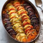 A cozy and flavorful Cheesy Root Vegetable Gratin featuring layers of sweet potatoes, parsnips, and beets baked in a creamy Parmesan sauce, topped with melted Gruyere and fresh thyme – perfect for a festive Thanksgiving dinner side dish.