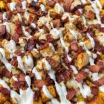 A hearty and flavorful Chicken Bacon Ranch Potato Skillet that combines crispy air-fried potatoes, seasoned chicken, crispy bacon, and melted mozzarella cheese, all topped with creamy ranch dressing. Perfect for a satisfying and easy weeknight meal.