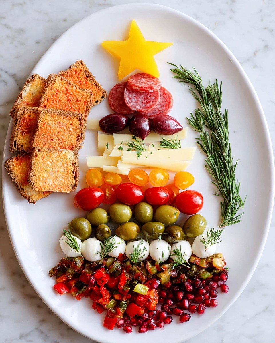 This is the fun part! Arrange your ingredients in a triangular shape to mimic a Christmas tree on your serving board or platter. Start with the larger slices of salami or cheese as your “base branches” and work upward layering the tomatoes, mozzarella, olives, and sweet peppers. Insert fresh rosemary sprigs between layers to look like pine needles and give off that irresistible holiday aroma. Then top it all off with your yellow bell pepper star. Careful here—take your time and enjoy the creative process.