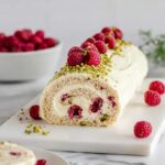 - Decorate and chill: Spread the remaining white chocolate cream evenly over the top of the rolled cake. Sprinkle chopped pistachios on top and arrange the reserved fresh raspberries for decoration. Transfer the roulade to a serving platter and refrigerate until ready to serve.