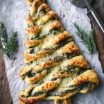 Spread your spinach filling evenly over the tree base, then sprinkle the remaining shredded cheese on top. Flip the second dough piece over the filling so it covers everything snugly—don’t hesitate to gently stretch it for a perfect fit. Using a pizza cutter, carefully slice about 1-inch wide branches on both sides, leaving the middle intact so the tree stays together. Now, twist each branch 2-3 times to create that fun, festive look. For the top short branch, just a half twist does the trick.