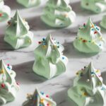 Delightful and festive Meringue Christmas Trees made by whipping egg whites with sugar and cream of tartar, tinted with green gel food coloring, piped into tree shapes, decorated with sprinkles, and baked to a crisp, airy texture. Perfect for holiday celebrations, these light and crunchy treats add a whimsical touch to your dessert table.