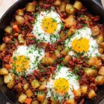 A hearty and flavorful Corned Beef Hash and Eggs recipe featuring crispy sautéed potatoes, tender corned beef, and perfectly baked eggs served in a cast iron skillet. This dish combines savory spices and fresh herbs to create a comforting meal perfect for breakfast or brunch.