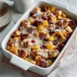 This Cranberry Apple Bread Pudding is a cozy, custardy dessert combining caramelized apples, tart fresh cranberries, and cubes of challah bread soaked in a rich vanilla-spiced custard. Baked to golden perfection and topped with a smooth vanilla glaze, it’s perfect for festive occasions or any comfort-food craving.