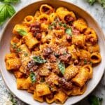 I love using long pasta like bucatini or spaghetti to wrap around the creamy sauce, but short, tubular pastas like rigatoni or penne work beautifully too since they catch bits of tomato and melted cheese inside.