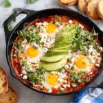- Finish and serve: Season the dish with additional salt and freshly ground black pepper to taste. Sprinkle the crumbled feta cheese and fresh parsley leaves over the top. Garnish with sliced avocado and microgreens if desired. Serve immediately with toasted bread for scooping and enjoying the saucy eggs.