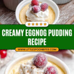 - Serve: Spoon the chilled eggnog pudding into serving dishes. Top with whipped cream, a sprinkle of grated nutmeg, and sugared cranberries as desired. Enjoy your festive homemade eggnog pudding!