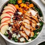 Personally, I don’t recommend freezing this salad because the fresh apples and kale don’t thaw well—they get a bit mushy. However, you can freeze cooked chicken and sweet potatoes separately and assemble fresh salad when you’re ready to eat.