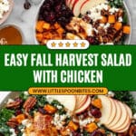 This Fall Harvest Salad combines nutrient-rich kale, roasted sweet potatoes, seasoned chicken breasts, and crisp honeycrisp apples, all tossed in a flavorful balsamic vinaigrette. Enhanced with creamy goat cheese, crunchy pecans, and sweet dried cranberries, this hearty salad captures the essence of autumn and makes for a satisfying, wholesome meal perfect for any occasion.