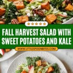 A vibrant and hearty Fall Harvest Salad featuring roasted sweet potatoes, crisp Brussels sprouts, fresh kale, and apples, all tossed in a creamy tahini maple dressing. This salad combines seasonal autumn produce with crunchy candied pecans and tangy feta cheese for a perfect balance of flavors and textures.