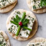 Festive Goat Cheese Christmas Present Appetizers are delightful and visually charming bite-sized treats perfect for holiday gatherings. Featuring herbed goat cheese elegantly shaped into gift-like squares on crunchy rice crackers, adorned with chive ‘ribbons,’ pink peppercorn ‘buttons,’ and fresh curly parsley leaves, these appetizers offer a combination of creamy, savory, and fresh flavors in a beautiful presentation.