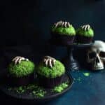 For parties, I like to arrange these cupcakes on a black slate board surrounded by faux cobwebs and mini pumpkins to amp up the creepy factor. Another fun idea is serving them in little terracotta pots lined with parchment paper—giving the illusion the fingers are growing right out of the earth!