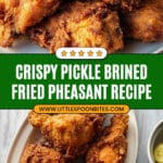 This pickle-brined fried pheasant recipe offers a flavorful twist on traditional fried poultry. The pheasant is soaked in pickle brine to tenderize and infuse it with subtle tanginess, then marinated in a spiced buttermilk mixture before being coated in a seasoned flour and corn starch batter. Fried until golden and crispy, this method ensures juicy, well-seasoned pheasant with a crunchy exterior, perfect for a hearty meal.