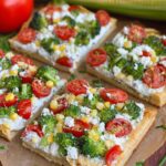 Once the puff pastry has cooled a bit, spread the cream cheese mixture evenly inside the scored border. You’ll see how this creamy layer offers the perfect canvas for the fresh veggies. Arrange the halved cherry tomatoes, fresh corn slices, chopped broccolini, and crumbled feta cheese on top. I like to scatter them evenly so each bite gets a little bit of everything. A sprinkle of fresh chives right before serving adds that final pop of color and a mild oniony bite that I adore.