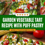 A delightful and easy-to-make Garden Vegetable Tart featuring a flaky puff pastry crust topped with a creamy blend of cream cheese and sour cream, fresh cherry tomatoes, sweet corn, broccolini, and crumbled feta cheese, garnished with fresh chives. Perfect as a savory snack or light meal, especially during summer when fresh garden vegetables are abundant.