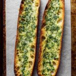 Using a sharp bread knife, cut your baguette lengthwise. I always line a baking sheet with parchment paper or nonstick foil to make cleanup a breeze. Place your baguette halves cut-side up, then spread that garlicky butter mixture evenly over both sides. Be generous here—you’ll thank me later.