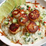 - Plate and Garnish: Spoon risotto onto plates, top with seared scallops. Garnish with lime wedges, slices of cucumber, crispy shallots or onions, and extra mint leaves for freshness and crunch.