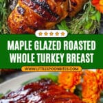 Place your turkey breast in a roasting pan with 1 cup of water added to the bottom to prevent drippings from burning. Roast for about 2 hours and 15 minutes, or until the internal temperature reaches 165°F (74°C). Every 30-40 minutes, brush more of the maple butter glaze on to build that gorgeous shiny crust. Be sure to spoon some of the pan juices over the turkey too—it keeps things moist and flavorful.