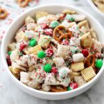 This Gluten-Free Christmas Chex Mix is a festive and crunchy snack perfect for holiday gatherings. It combines a colorful mix of gluten-free cereals, pretzels, peanuts, and red & green M&Ms, all coated in a delicious vanilla almond bark white chocolate melt. Easy to make and visually vibrant with optional sprinkles, this treat is a delightful mix of sweet and salty flavors that sets beautifully for a perfect party snack or holiday gift.
