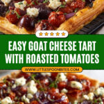 - Add Tomatoes and Goat Cheese: Using a slotted spoon, transfer the roasted cherry tomatoes onto the tart evenly. Crumble the goat’s cheese over the top. Add fresh thyme sprigs or pluck some leaves and sprinkle them over the tart for fragrance and flavor.