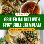 A vibrant and flavorful grilled halibut recipe featuring a spicy Calabrian chile gremolata that perfectly complements the tender, flaky white fish. This dish combines fresh lemon, parsley, garlic, and Calabrian chiles with olive oil for a bright and slightly spicy topping, making it a perfect summer meal.