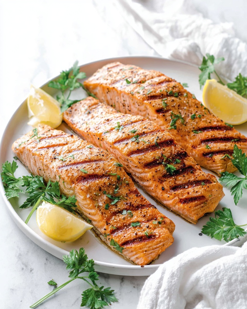 This easy grilled salmon recipe delivers perfectly cooked, flavorful salmon fillets with a simple combination of olive oil, melted butter, lemon juice, salt, and pepper. Ready in under 15 minutes, it’s a foolproof way to enjoy a healthy, delicious seafood meal.