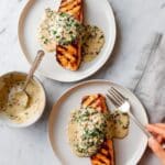 Plate your grilled salmon steaks and drizzle generously with the mustard chive sauce. I like to add a few extra fresh chives on top for a pop of color and fresh bite. This is one of those dishes that looks like you spent hours in the kitchen, but it’s actually a breeze!