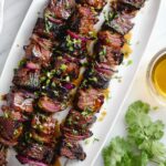 Grilled Sticky Sesame Steak Skewers feature tender sirloin steak marinated in a flavorful blend of garlic, ginger, dark brown sugar, oyster sauce, tamari, and sesame oils. Grilled to perfection with red onions and brushed with a caramelized sticky glaze, these skewers are bursting with savory, sweet, and nutty flavors, perfect for a quick and impressive meal.