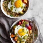 This Harvest Roasted Vegetable Grain Bowl features perfectly roasted sweet potatoes, Brussels sprouts, red onion, and red pepper tossed with a flavorful basil vinaigrette and hearty farro. Topped with your choice of perfectly cooked eggs, this nutrient-packed, fall-inspired dish is both filling and delicious, ideal for a wholesome dinner or lunch.