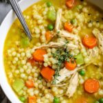 This comforting and flavorful chicken soup combines fresh vegetables, aromatic herbs, and tender chicken simmered in a savory broth with pearl couscous. Enhanced with ginger and turmeric for a subtle warmth and health boost, this recipe promises a hearty and wholesome meal perfect for any season.
