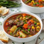 A hearty Vegetable Beef Soup loaded with tender chunks of beef, fresh vegetables, and flavorful herbs simmered in a rich broth. Perfect for any season, this comforting soup brings together wholesome ingredients for a satisfying meal that’s as delicious as it is nutritious.