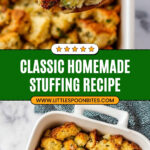This classic homemade stuffing recipe combines toasted Texas toast bread cubes with sautéed onions, celery, garlic, fresh herbs, and a savory mixture of eggs and chicken broth for the perfect Thanksgiving side dish. Baked until golden and crispy on top, this flavorful stuffing is moist, aromatic, and easy to make ahead, making it an essential comfort food for your holiday table.