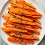 - Garnish and serve: Remove the carrots from the oven. If desired, sprinkle fresh thyme leaves over the top for an aromatic garnish before serving.