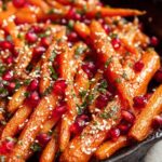Honey Maple Roasted Carrots are a deliciously sweet and savory side dish featuring tender carrots roasted to caramelized perfection with a drizzle of maple syrup and honey, seasoned with fragrant coriander, sea salt, and fresh herbs. This easy-to-make recipe is topped with nutty sesame seeds and vibrant pomegranate arils for a beautiful, flavorful presentation perfect for any meal.