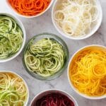 Freezing veggie noodles isn’t my favorite method because they tend to get watery and mushy upon thawing. But if you want to freeze, I recommend blanching the sturdier noodles like sweet potato or butternut squash first, then freeze in a single layer before transferring to bags.