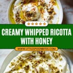 For entertaining, I’ll sometimes serve this whipped ricotta in individual small bowls topped with drizzled honey and pistachios, alongside different flavored olive oils or a drizzle of balsamic glaze. It also looks stunning served with colorful roasted cherry tomatoes or figs scattered around to elevate the visual and flavor experience.