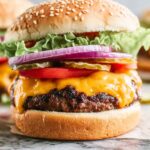 This classic hamburger recipe features juicy ground chuck patties seasoned with a flavorful spice blend, grilled to perfection and topped with melted American cheese. Served on toasted buns with fresh lettuce, tomato, onions, and pickles, it offers a delicious and satisfying meal perfect for any occasion.