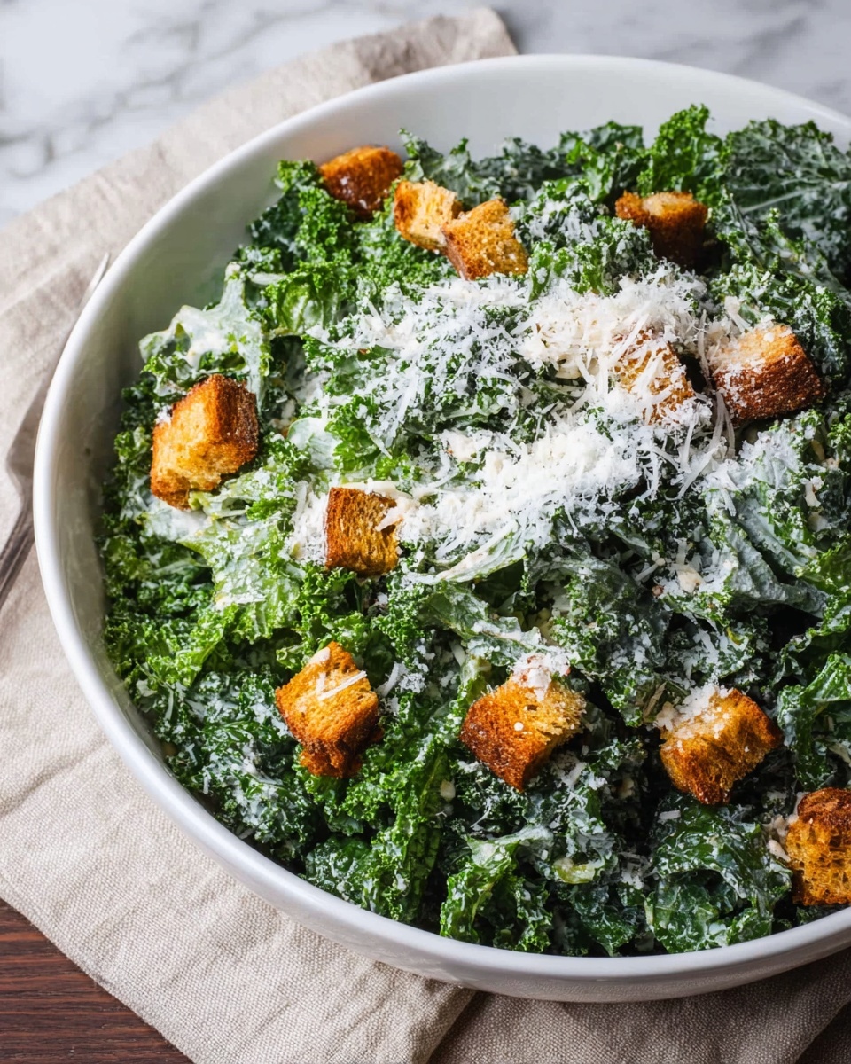 For special occasions, I like to serve this Kale Caesar Salad in individual glass dishes layered with the dressing, salad, and croutons so guests can see all the textures. You can also present it in a hollowed-out bread bowl for a fun twist! Adding edible flowers or microgreens as a garnish creates a beautiful pop of color that’s perfect for dinner parties.