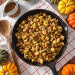 Last but certainly not least, heat your turkey gravy until warm and drizzle it generously over the top of your hash. I like to spoon it over right before serving to keep the potatoes crisp but still give that silky, saucy finish. Give it one last gentle toss if you like, or serve as is with gravy pooling on top—it’s delicious either way.