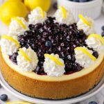- Assemble and Serve: Remove the chilled cheesecake from the refrigerator and carefully release and remove the sides of the springform pan. Place the cheesecake on a serving platter. Pipe or dollop swirls of whipped cream around the edges of the cheesecake. Spoon the cooled blueberry topping over the center of the cheesecake. Garnish with lemon slices if desired. Keep the cheesecake refrigerated until serving. Best enjoyed within 3 to 4 days for optimal freshness.