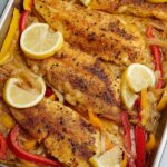 Place the tilapia fillets on top of the bed of onions and peppers. Generously spoon the marinade over both sides of the fillets — don’t be shy here, it’s where all the flavor comes from. Then, pop the thin lemon slices over the fish; they not only taste great but make your dish look gorgeous. Slide the tray into the oven high up, and bake for about 10-12 minutes. The fish should be opaque and flake easily with a fork when done. Trust me, the 12-minute max is key to keeping it tender and juicy.
